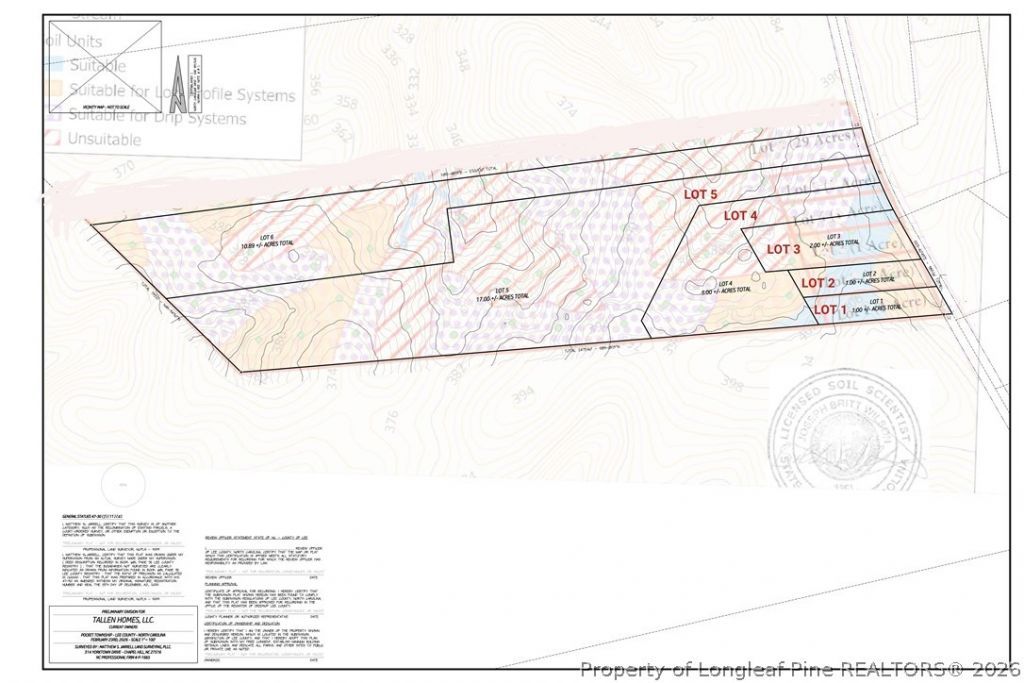 Ready-to-Build 17-Acre Lot. Need a builder? Owner is Tallen Homes LLC, Lets discuss building your dream home and bring your vision to life on this beautiful 1-acre proposed lot. Located in Lee Countys desirable Residential Agricultural (RA) district, this property offers the perfect blend of rural privacy and accessibility. Preliminary soil analysis is complete, indicating suitability for a conventional or low-profile septic system???saving you time and money. Currently part of a 34-acre tract; final plat and PIN are in process. Dont miss this opportunity to secure your piece of North Carolina countryside! No HOA. See MLS #s 756754, 756759, 756761, 756762, 756763 for all lots as part of the 34 acre parcels.